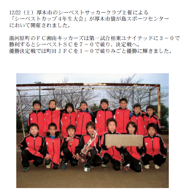 11/10・17日に神奈川県の32会場で開催された第36回神奈川県少年サッカー選手権大会(低学年の部)で湯河原町から参加したFC湘南キッカーズは見事、第31ブロックで優勝に輝き中央大会に進出を決めた。